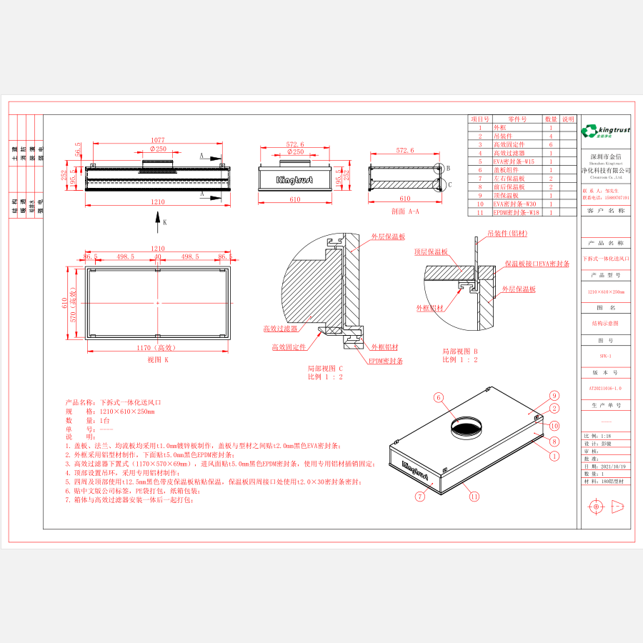 下拆式一体化高效送风口,由静压箱和空气过滤器组成。采用专用铝型材制作静压箱,箱体内下部,内置无隔板高效过滤器。该送风口具有通用性强、外形美观、高效过滤器安装更换方便、维护简单、投资少、过滤效率高等优点,适用于净化级别较高的百级、千级以上空气净化系统的终端过滤送风装置。